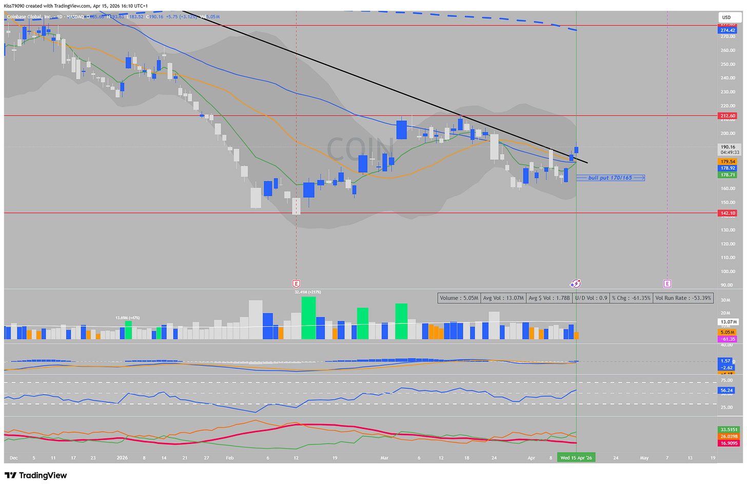 Privind graficul zilnic (15 Aprilie 2026), observăm o schimbare majoră de caracter. $COIN$ a petrecut ultimele luni sub o linie de trend descendentă (down trendline) care a acționat ca un capac asupra prețului.