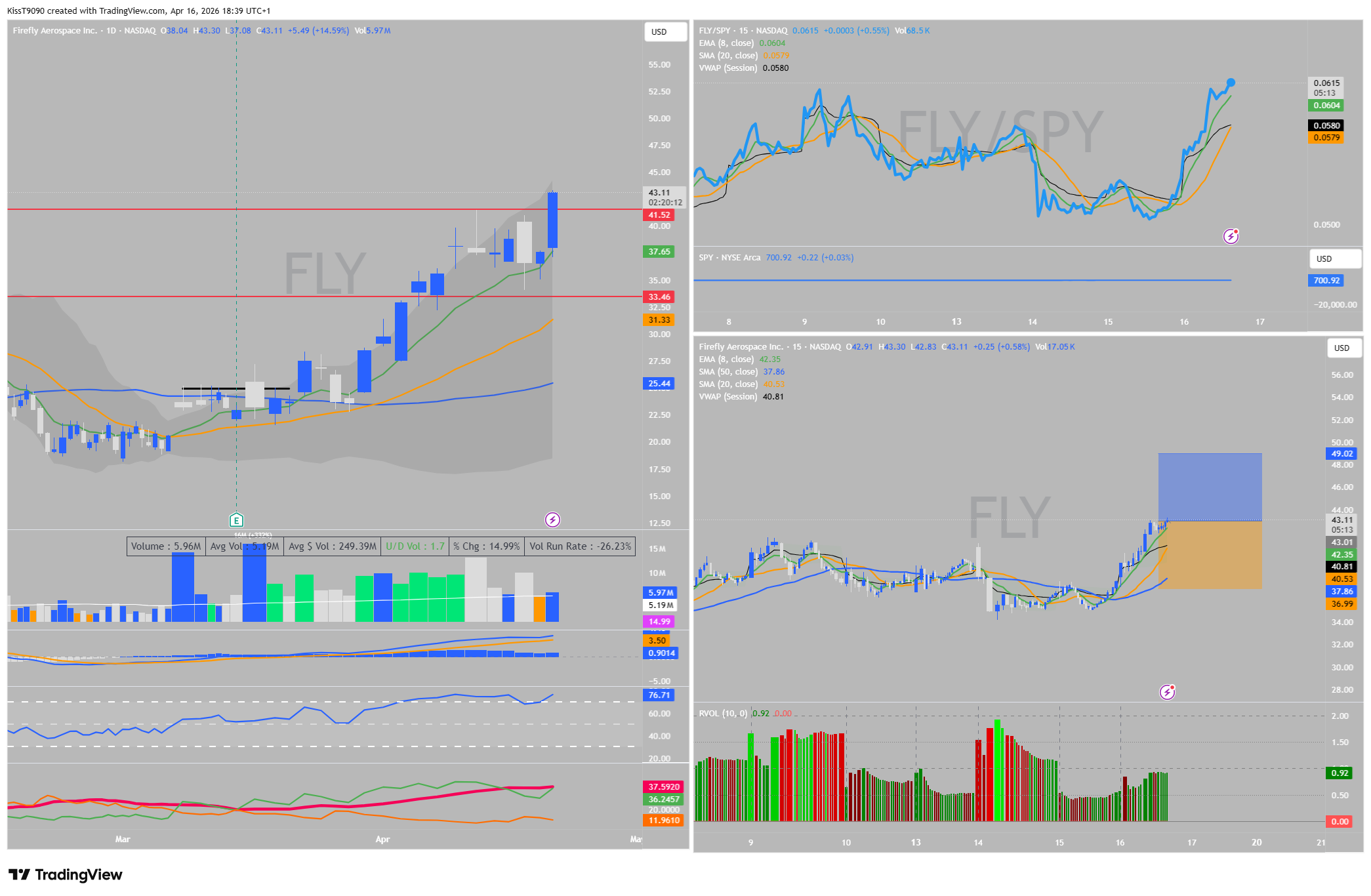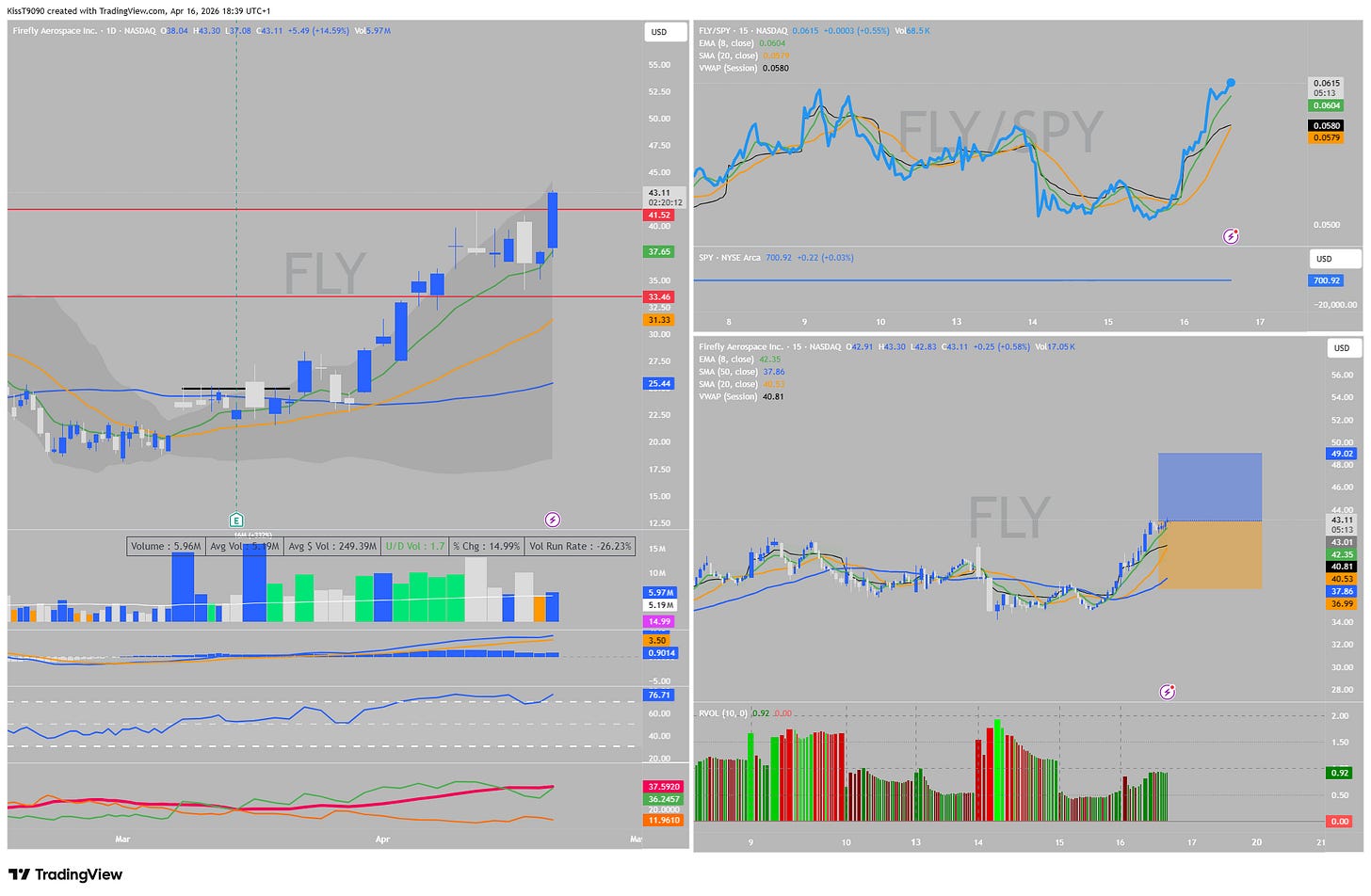 Analizând graficul de 15 minute, am observat un Strong Relative Strength față de SPY. În momentele în care indicele principal ezita, $FLY făcea minime tot mai înalte (Higher Lows). VWAP-ul la **40.77$** a servit ca o ancoră, prețul rămânând constant deasupra lui, ceea ce indică o acumulare agresivă.