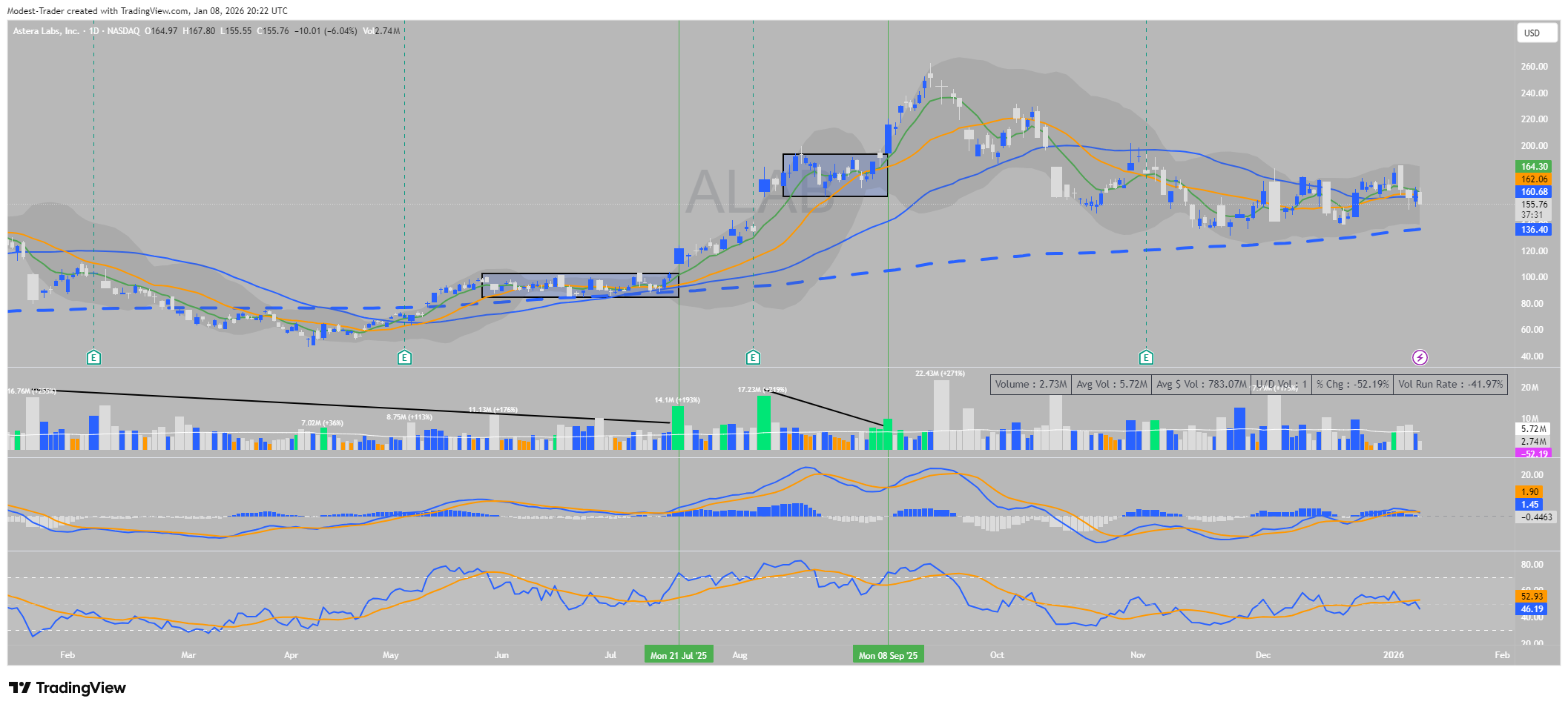 Partea de sus: Prețul stă plat (lateral) de 2 săptămâni, „lipit” de 20 MA și 8 EMA.
