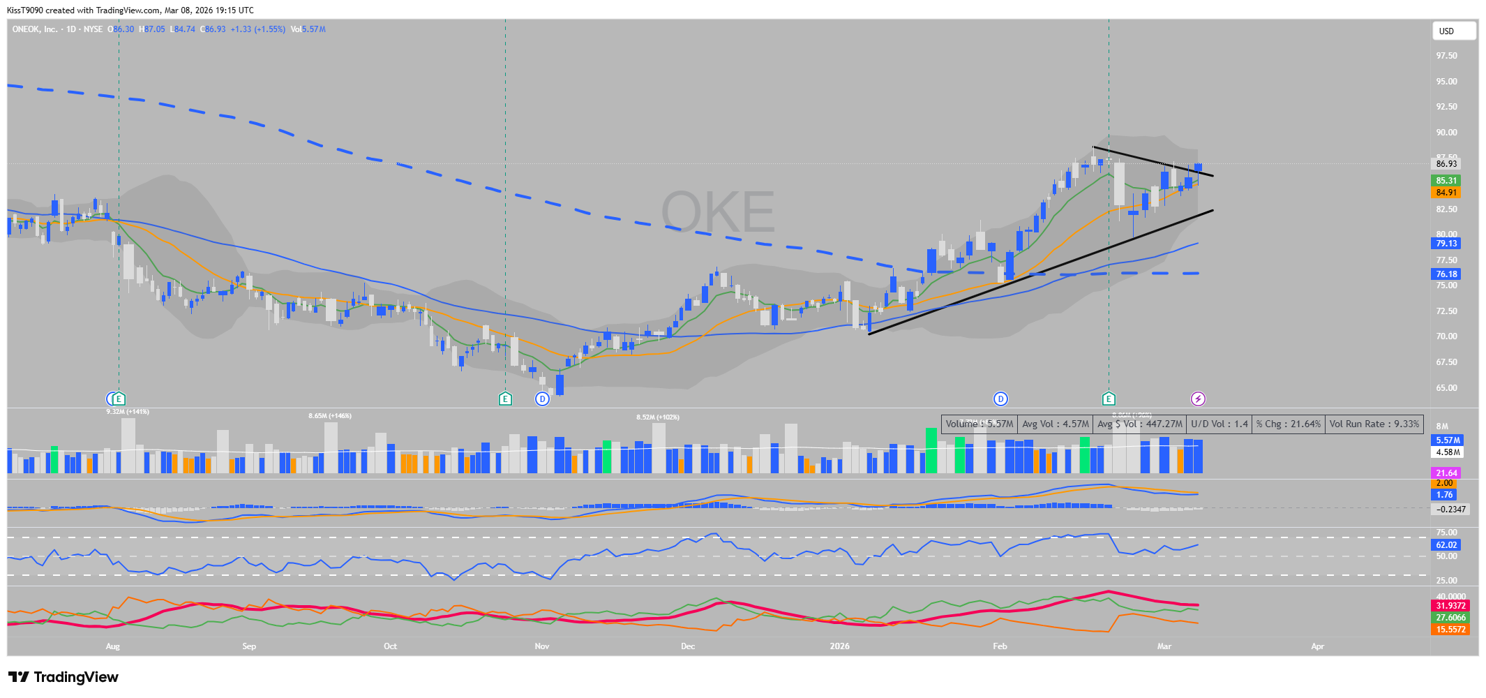 Forță Relativă: În timp ce $SPY a căzut cu -1.31%, $OKE a reușit o închidere pozitivă de +1.55%, la prețul de 86.93$.